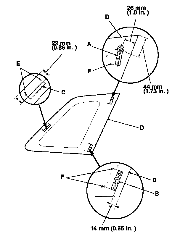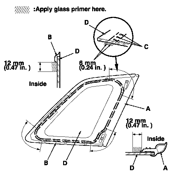 - With the printed dots (C) on the quarter glass (D) as a guide, apply the glass primer to the front portion of the quarter glass.