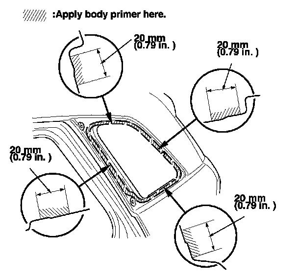 15. With a sponge applicator, carefully apply a light coat of body primer to any exposed paint or metal around the flange where new adhesive will be applied. Let the primer dry for at least 10 minutes: