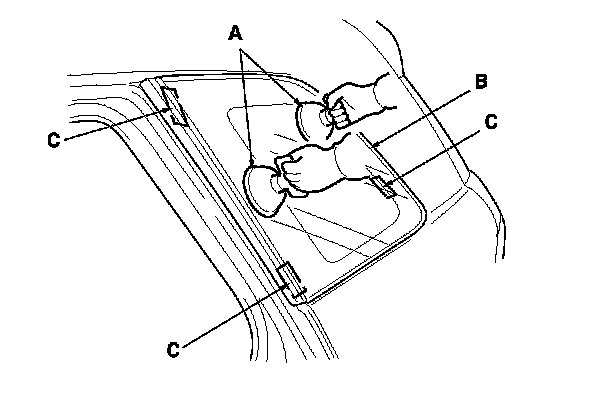 18. Use suction cups (A) to hold the quarter glass (B) over the opening, align it with the clips (C) and set it down on the adhesive. Lightly push on the quarter glass until its edges are fully seated on the adhesive all the way around.