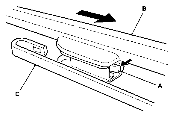 2. Press and hold the tab (A) and side the wiper blade (B) toward the tabs until it releases from the wiper arm (C).