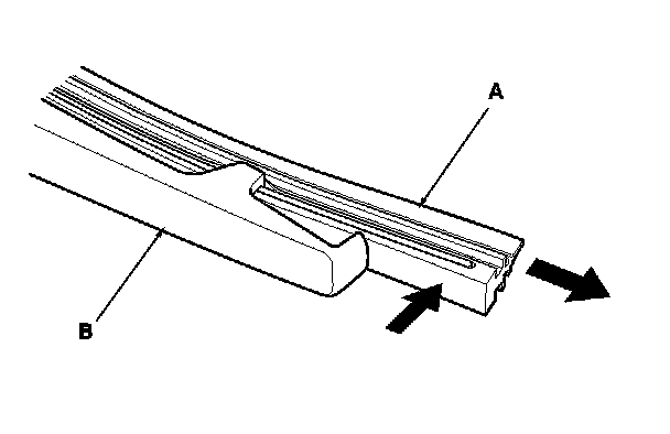 3. Raise the old rubber blade insert (A), and remove it from the wiper blade (B).