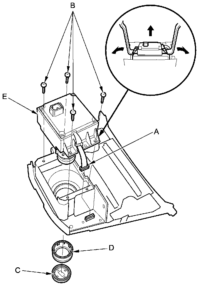 4. Remove the screws (B), then remove the knob (C) and the dial (D) from the interface dial (E) with two KTC trim tools and applying even force as shown.