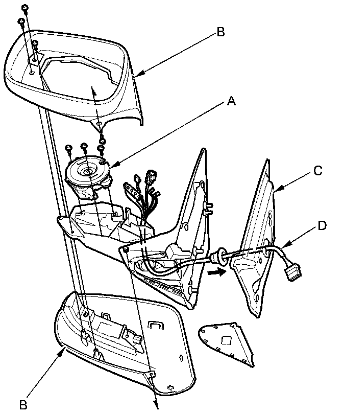 6. Remove the gasket (C) and the harness (D) from the power mirror.