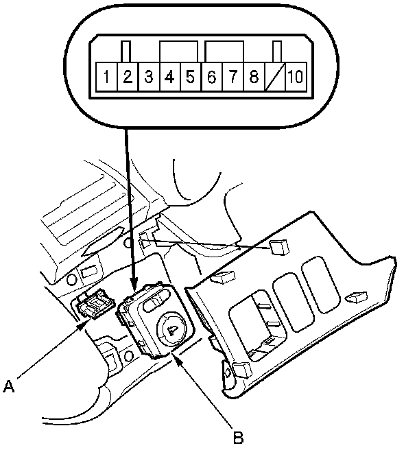 2. Disconnect the 10P connector (A) from the power mirror switch (B).