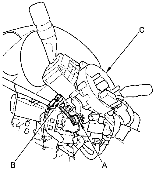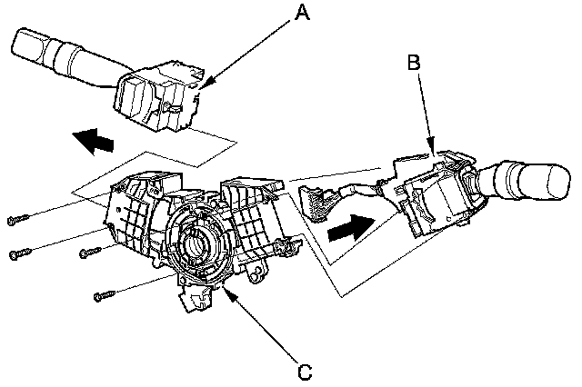 8. Remove the combination light switch (A) and the wiper/washer switch (B) from the combination switch body assembly (C).