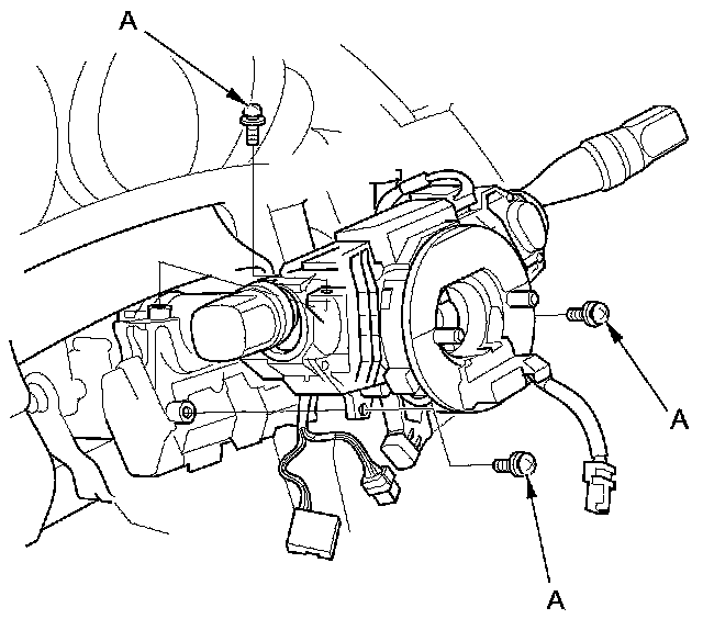5. Remove the combination switch assembly/cable reel mounting screws (A).
