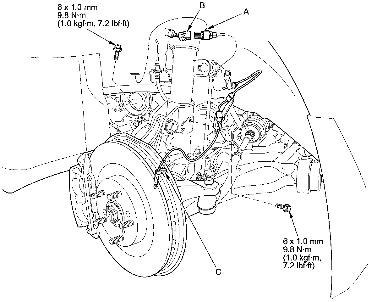 3. Remove the bolts and the wheel speed sensor (C).