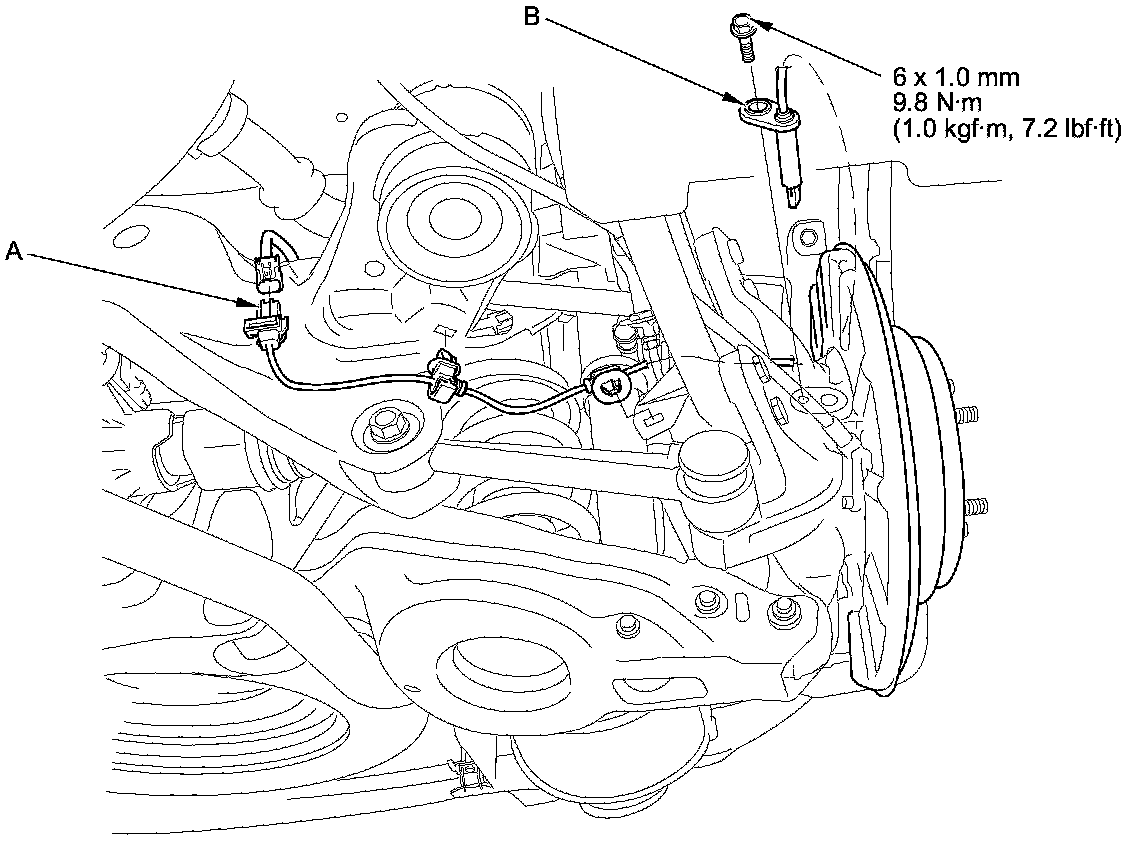 2. Remove the clip (A), then disconnect the wheel speed sensor connector (B).