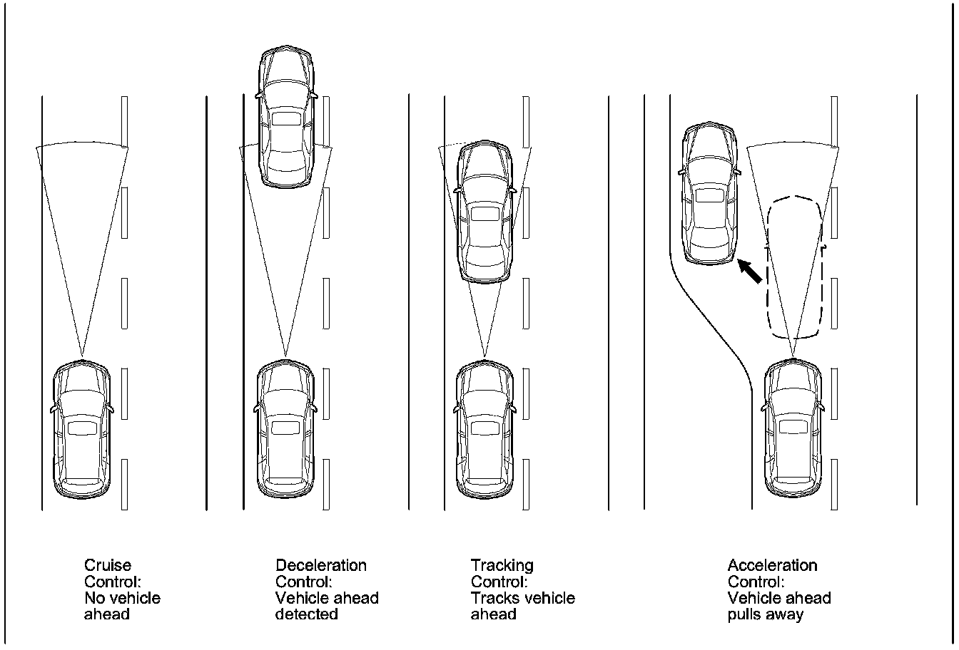 - If the ACC detects a slow vehicle and the distance to the vehicle ahead is closing, the vehicle speed is reduced primarily by closing the throttle, and additional slowing is accomplished by using the brakes. If the vehicle ahead is too close, an alarm sounds.