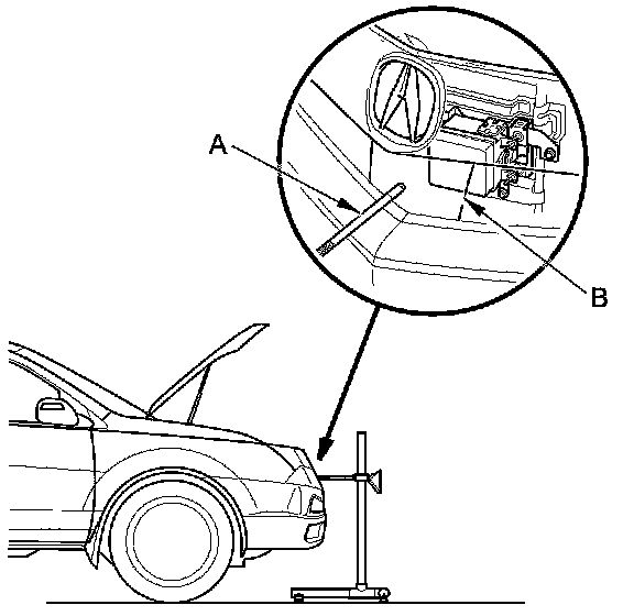 5. Adjust the tip of the height rod (A) on the target to the center of the front radar cover (B).