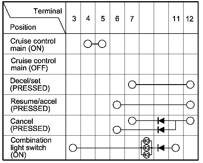 - If there is continuity, and it matches the table, but the cruise control combination switch failure occurred on the cruise control input test, check and repair the wire harness on the switch circuit.