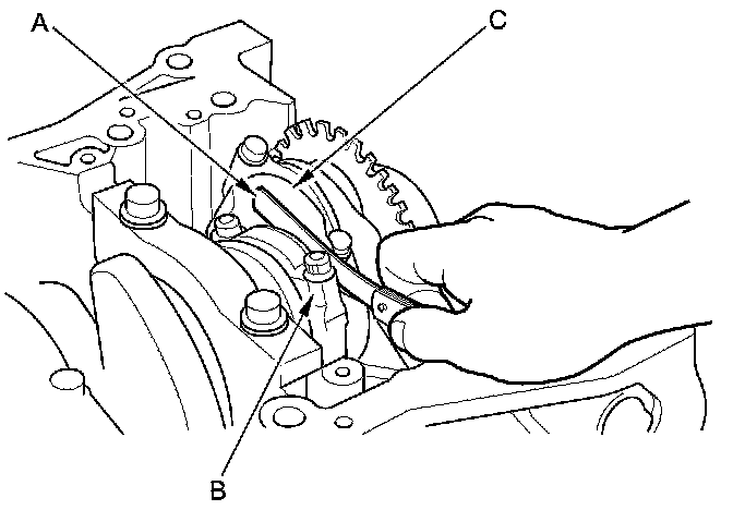 3. Measure the connecting rod end play with a feeler gauge (A) between the connecting rod (B) and the crankshaft (C).