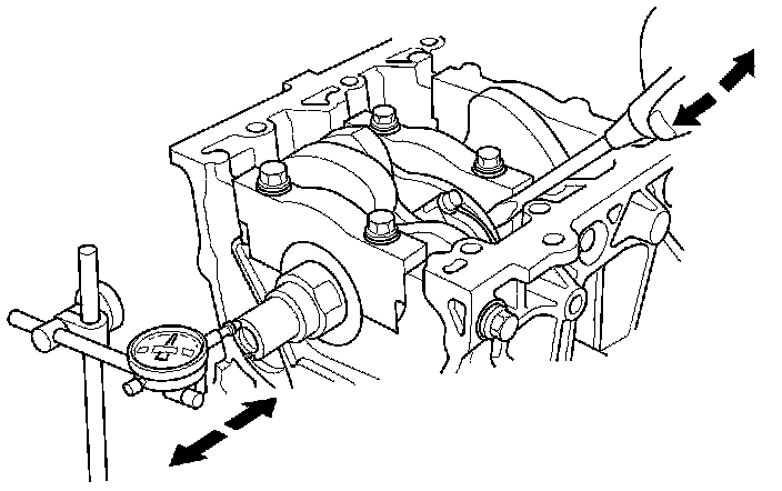 5. To check crankshaft end play, push the crankshaft firmly away from the dial indicator by prying, and zero the dial against the end of the crankshaft. Then pull the crankshaft firmly back toward the indicator by prying; the dial reading should not exceed the service limit.
