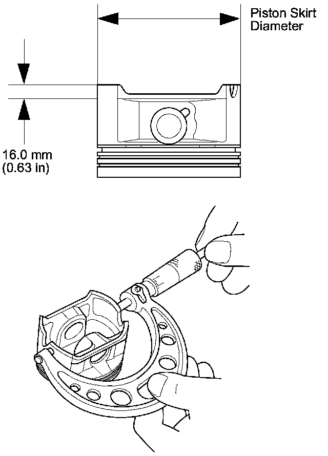3. Measure the piston skirt diameter at a point 16.0 mm (0.63 in) from the bottom of the skirt.