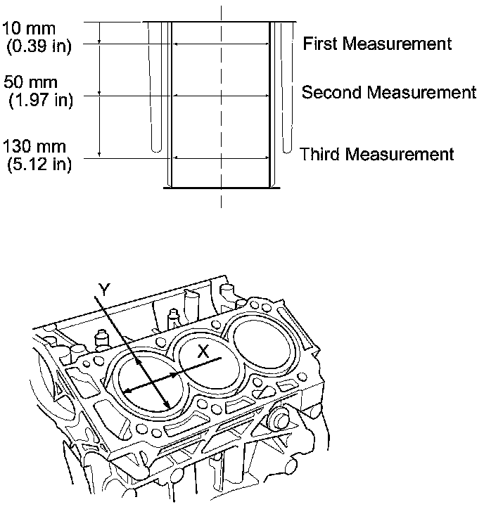 4. Measure the wear and taper in direction X and Y at three levels in each cylinder as shown.