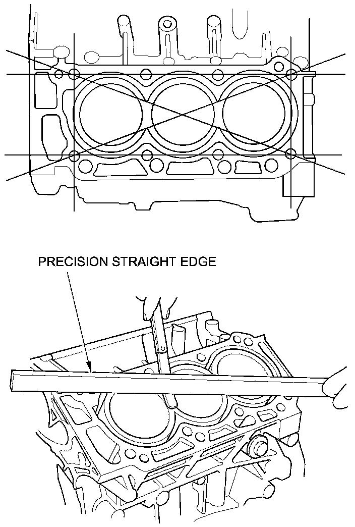 6. Check the top of the engine block for warpage. Measure along the edges and across the center as shown.