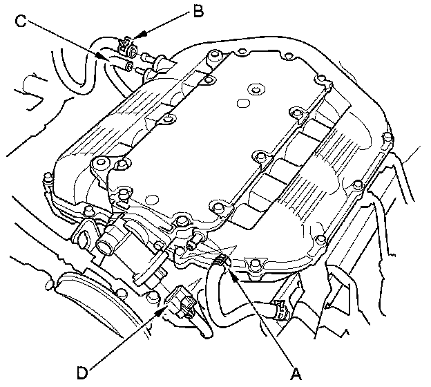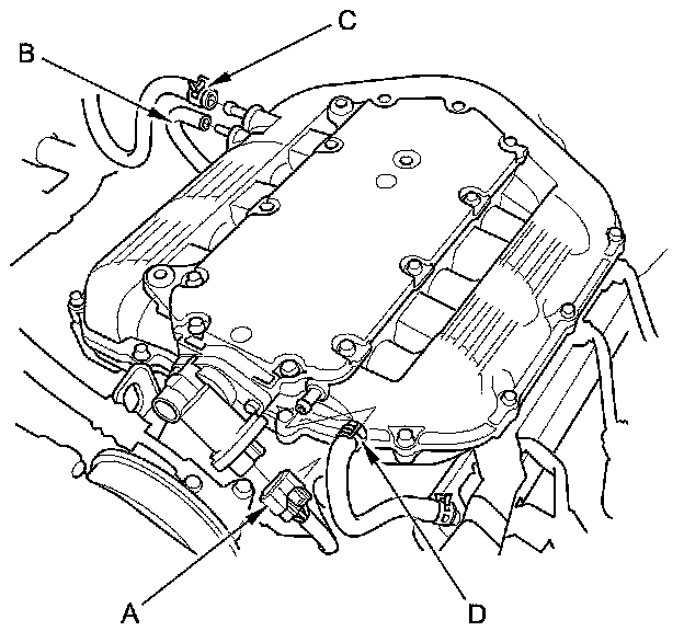 4. Disconnect the PCV hose (A), the brake booster vacuum hose (B), the vacuum hose (C), and the IMT actuator connector (D).