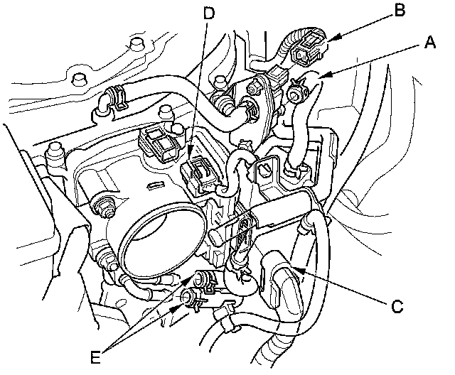 4. Connect the MAP sensor connector (B), the throttle actuator connector (C), the EVAP canister purge valve connector (D), and the EVAP canister purge hose (E).