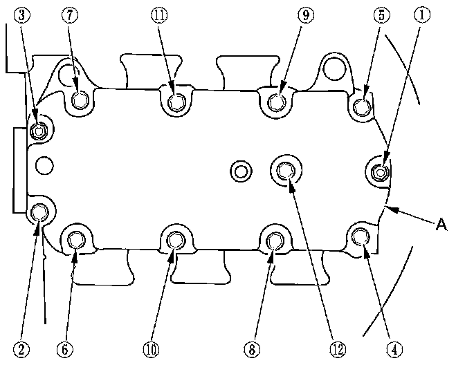 2. Install the upper cover (A). Tighten the bolts and nuts sequentially in three steps. Always use a new gasket.