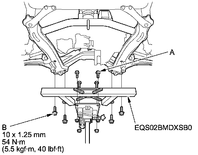 58. Loosen the four bolts (A) holding the adjustable arms (B) of the front subframe adapter (EQS02BMDXSBO) to its center plate.