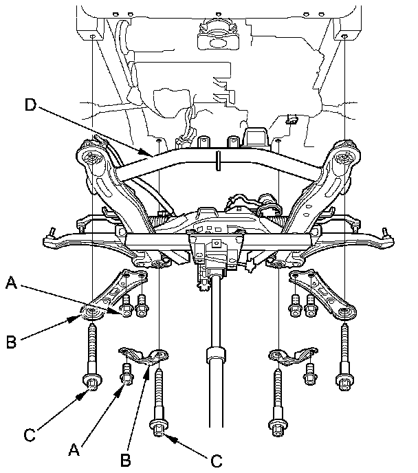 61. Remove the six 12 x 1.25 mm bolts (A) securing the subframe stiffeners (B), the four subframe mounting bolts (C), and the stiffeners, then lower the front subframe (D).