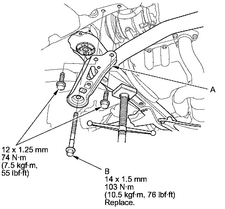 6. Support the front subframe with the engine support. Remove the bolts and the front subframe stiffener (A).