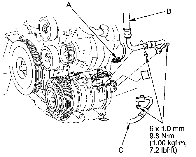7. Disconnect the A/C compressor clutch connector (A). Remove the bolts and the nut, then disconnect the suction hose (B) and discharge hose (C) from the A/C compressor. Plug or cap the lines immediately after disconnecting them to avoid moisture and dust contamination.