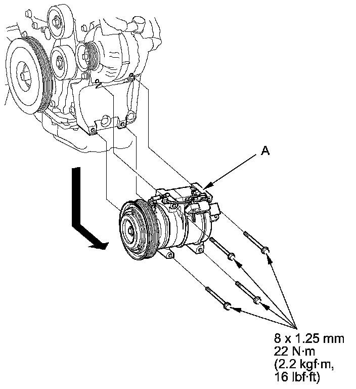 9. Install the A/C compressor in the reverse order of removal, and note these items: