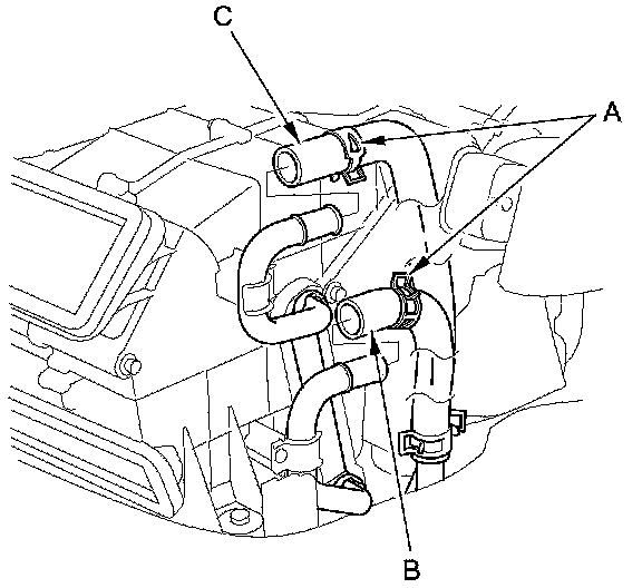 3. Slide the hose clamps (A) back, then disconnect the rear inlet heater hose (B) and the rear outlet heater hose (C) from the rear heater core. Note the layout of the hose.