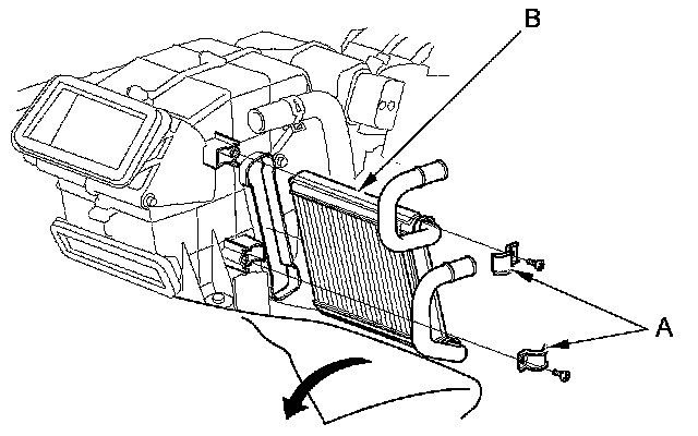 4. Turn over the carpet. Remove the self-tapping screws and the clamps (A). Carefully pull out the rear heater core (B) without bending lines.