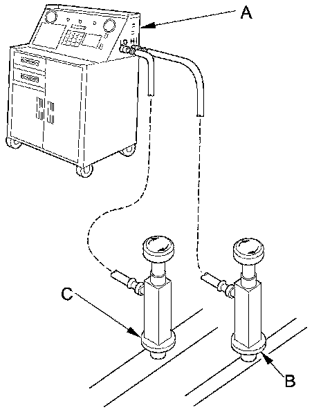 2. Connect an R-134a refrigerant recovery/recycling/charging station (A) to the high-pressure service port (B) and the low-pressure service port (C), as shown, following the equipment manufacturer's instructions. Recover the refrigerant, if any, from the A/C system A/C Refrigerant Recovery.