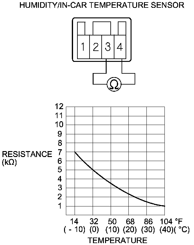 3. Compare the resistance reading between terminals No. 4 and No. 3 of the humidity/in-car temperature sensor with the specifications shown in the graph; the resistance should be within the specifications.