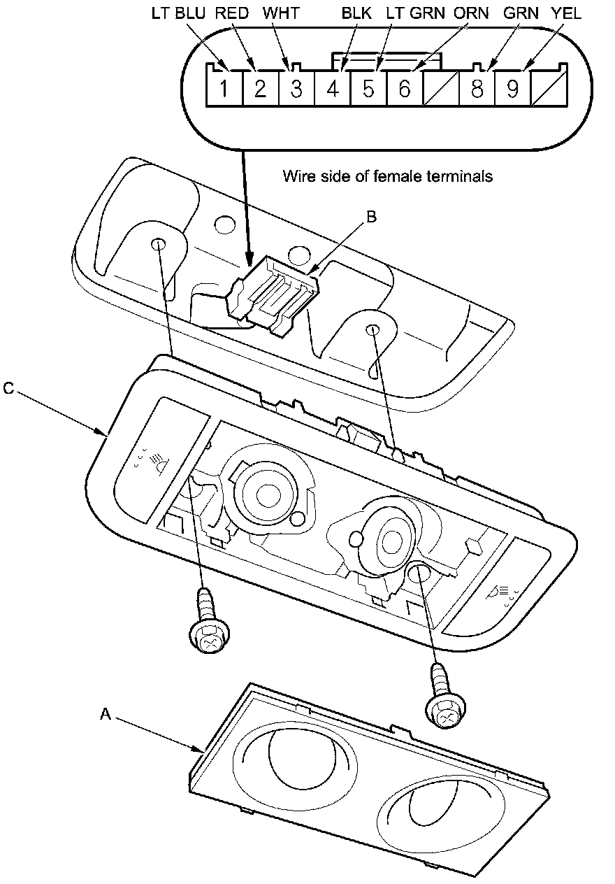 3. Disconnect the 10P connector (B) from the rear individual map light (C).