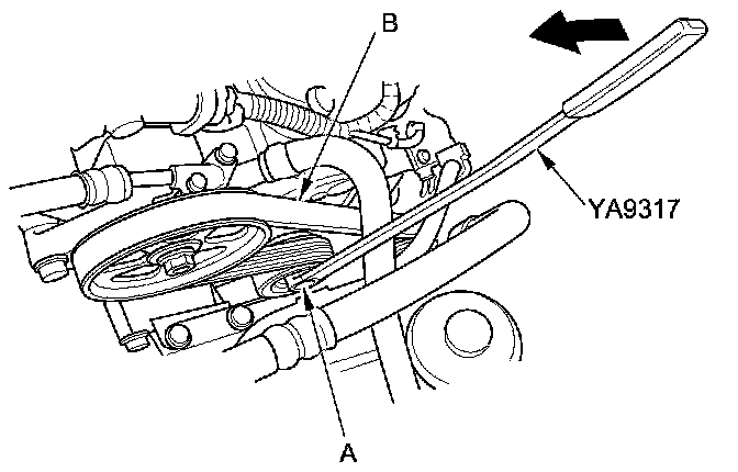 1. Move the auto-tensioner (A) using the belt tension release tool in the direction of the arrow to relieve tension from the drive belt (B), then remove the drive belt.