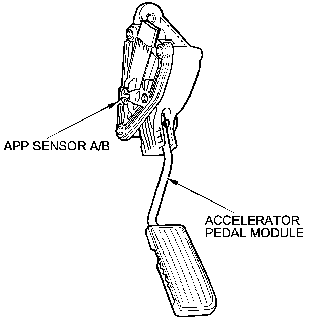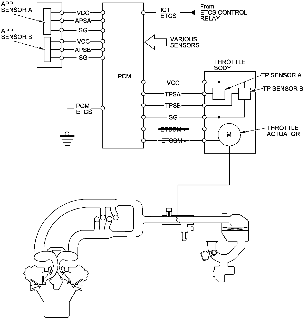The electronic throttle control system consists of the throttle actuator, throttle position (TP) sensor A/B, accelerator pedal position (APP) sensor A/B, the electronic throttle control system (ETCS) control relay, and the PCM.
