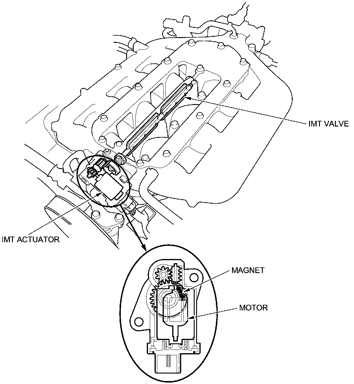 The intake manifold tuning (IMT) actuator contains a sensor that detects the IMT valve position and sends it to the PCM.