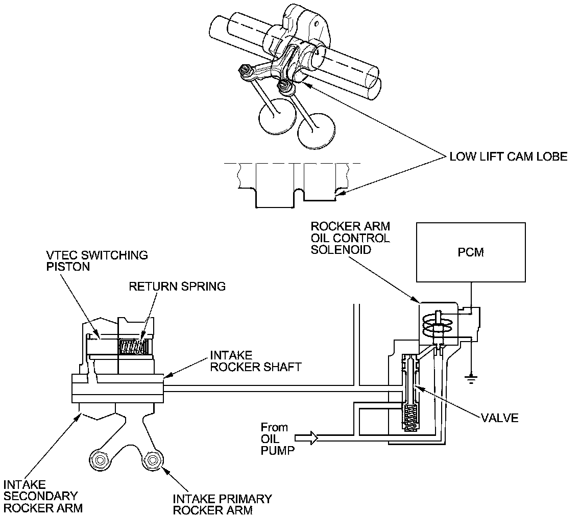 The rocker arm oil control solenoid is turned on by the PCM. Oil pressure from the rocker arm control solenoid enters into the intake secondary rocker arm via the rocker shaft, and it moves the VTEC switching piston in the intake secondary rocker arm. This causes the VTEC switching piston to slide into the primary rocker arm, locking the primary and secondary rocker arms together. Both intake rocker arms are lifted by the high lift cam lobe.