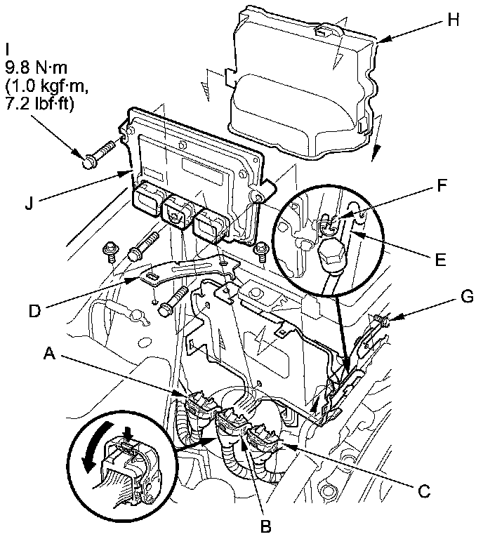 4. Remove the cover (H), then disconnect PCM connectors A, B, and C.