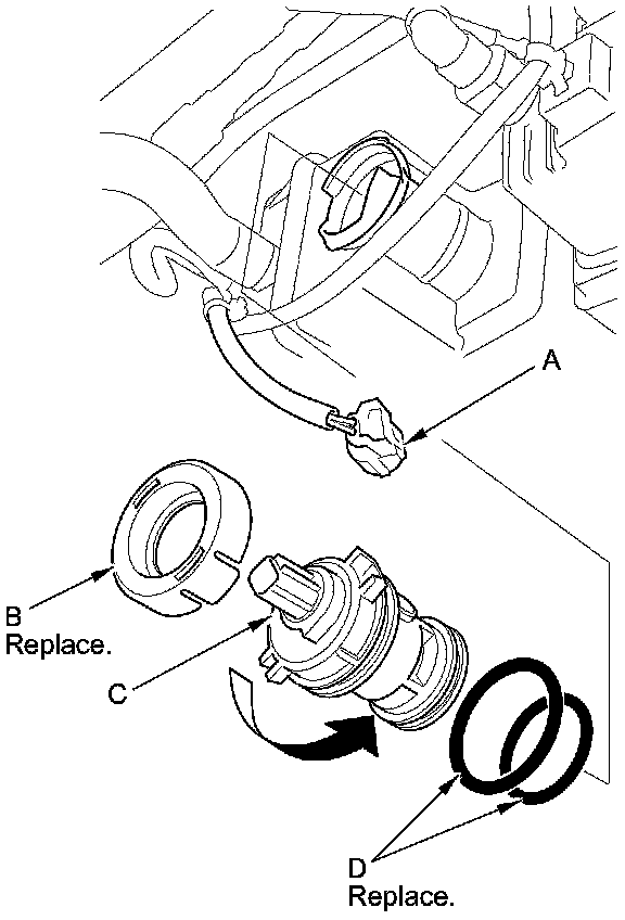 6. Install the parts in the reverse order of removal with new O-rings (D) and a new cap.