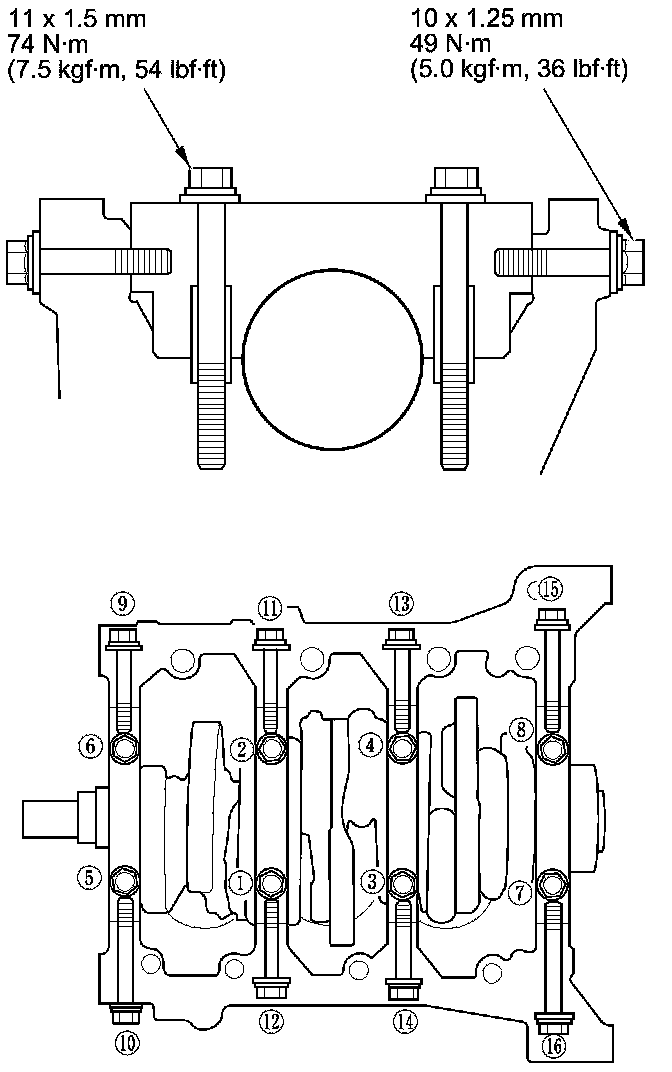 Tighten bearing cap bolts and side bolts to specified torque in sequence as shown. Repeat torque sequence again to ensure bolts are properly torqued.