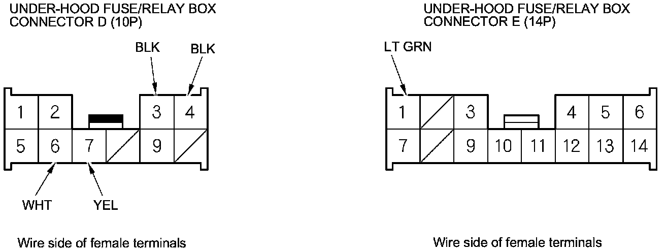 3. Disconnect under-hood fuse/relay box connectors D (10P) and E (14P).