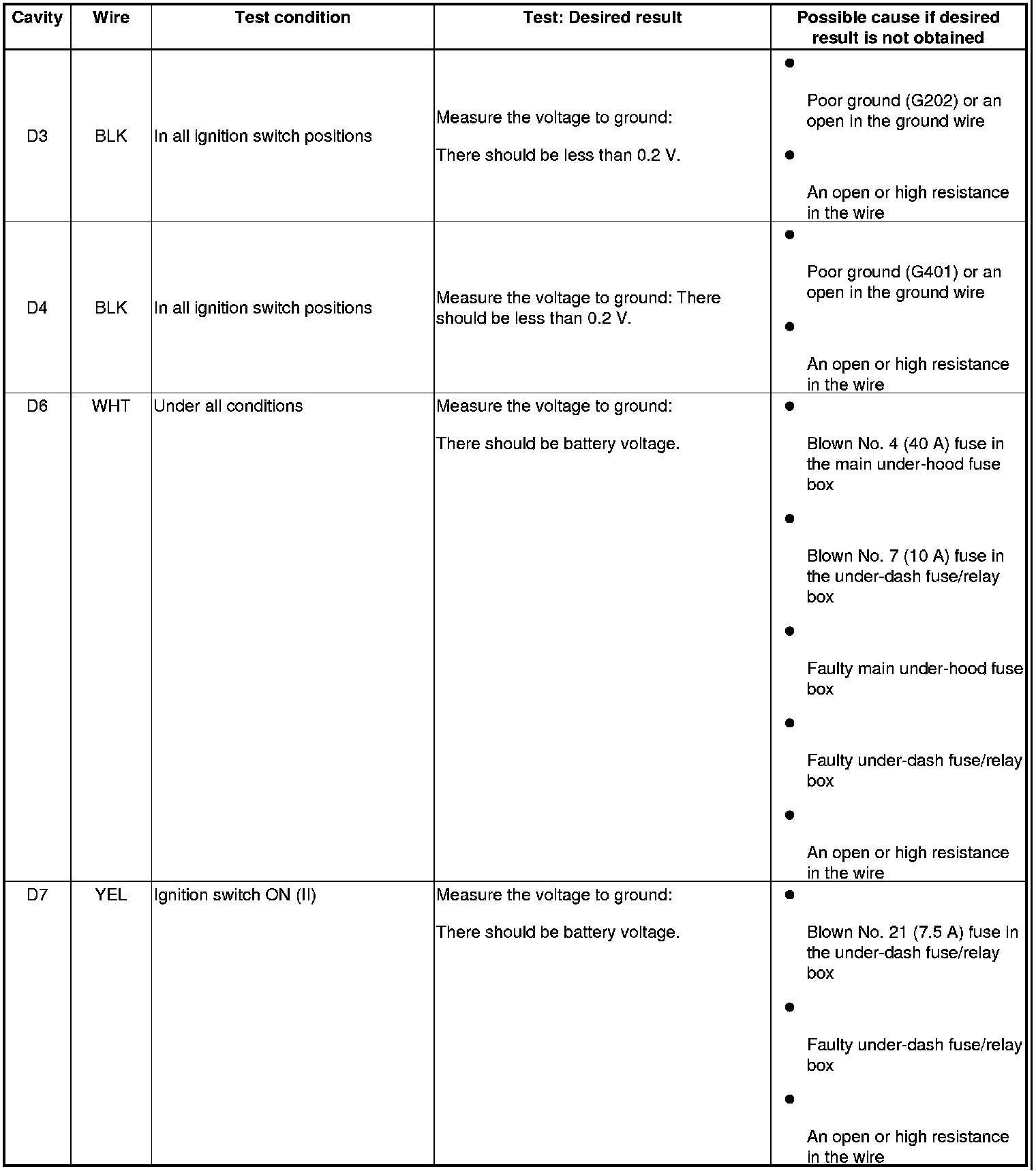 NOTE: Before testing the relay control module, troubleshoot the multiplex integrated control unit first, using B-CAN System Diagnosis Test Mode A Troubleshooting - B-CAN System Diagnosis Test Mode A.
