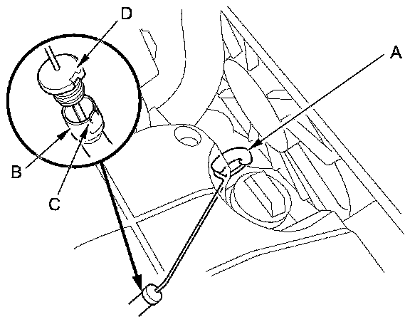 4. Insert the dipstick back into the dipstick guide tube (B) aligning the notch (C) with the guide tab (D).