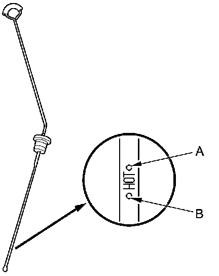 5. Remove the dipstick and check the fluid level. It should be between the upper mark (A) and the lower mark (B).