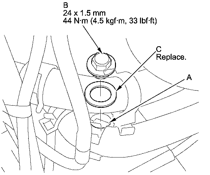 9. Install the ATF filler bolt (B) and a new sealing washer (C).