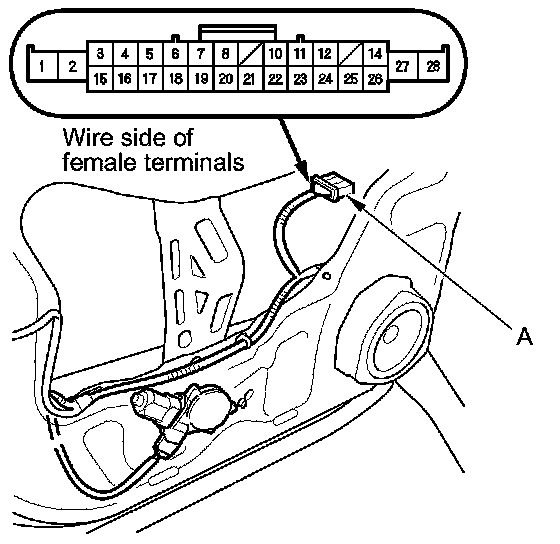 1. Remove the door panel Front Door Panel Removal/Installation, and disconnect the driver's door wire harness B 28P connector (A) from the driver's door wire harness A.