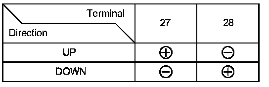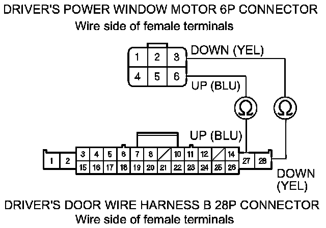 2. At the driver's door wire harness B 28P connector, test the power window motor in each direction by connecting battery power and ground according to the table. When the motor stops running, disconnect one lead immediately.
