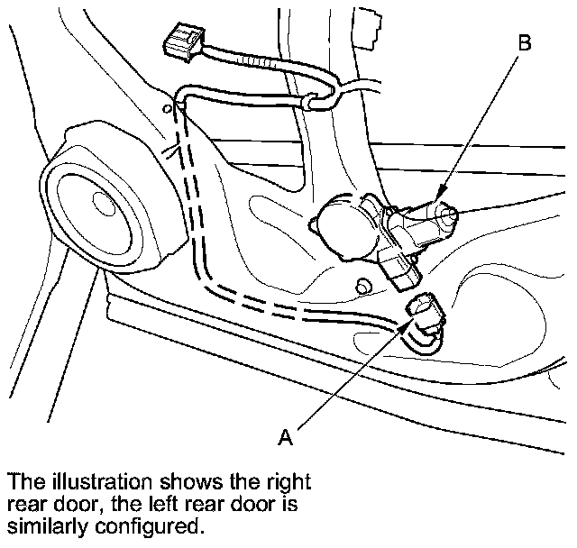4. Disconnect the 6P connector (A) from the rear power window motor (B).