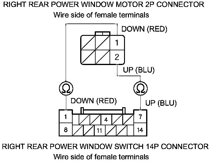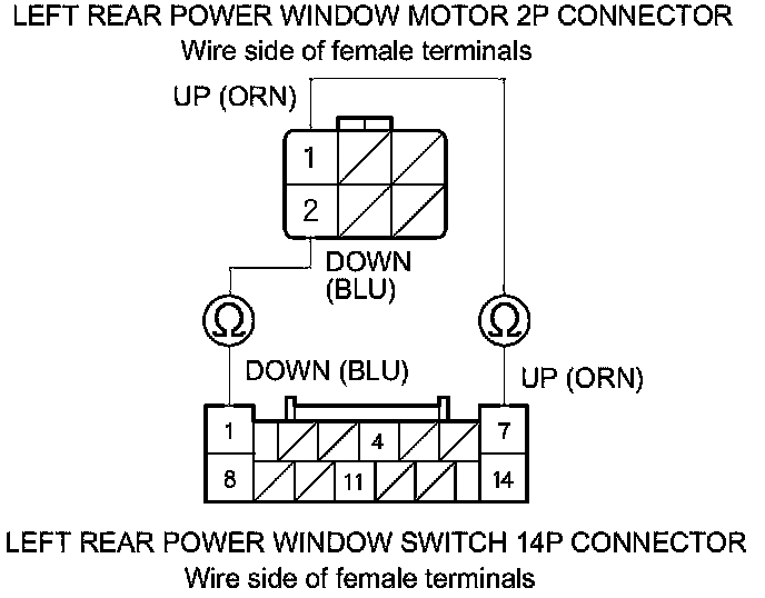 5. Check for continuity between rear power window motor 6P connector terminals No. 1 and No. 2 and rear power window switch 14P connector terminals No. 1 and No. 7 respectively. There should be continuity.