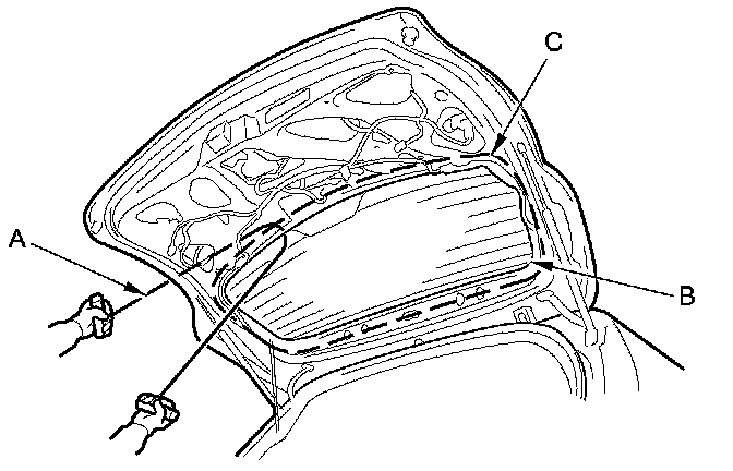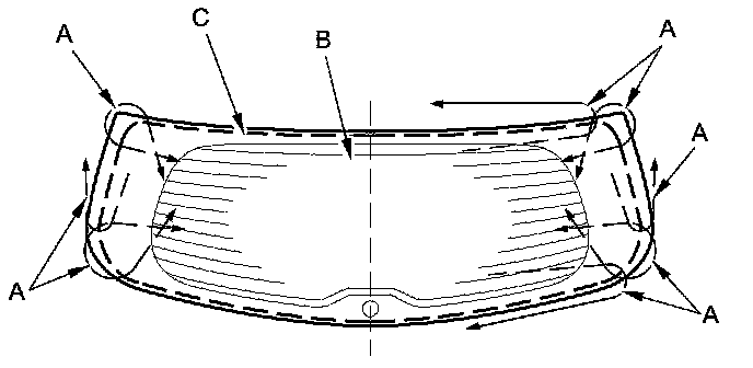 5. With a helper on the outside, pull the piano wire (A) back and forth in a sawing motion. Hold the piano wire as close to the rear window (B) as possible to prevent damage to the tailgate, and carefully cut through the adhesive (C) around the entire rear window.